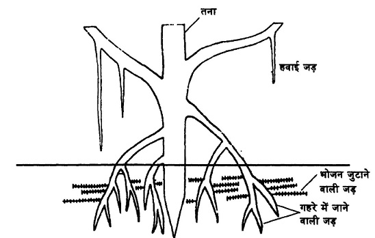 मेंग्रोव की जड़ प्रणाली मेन्ग्रोव में पाए जाने वाले पौधों का जड़तंत्र अन्य पौधों से काफी भिन्न होता है। चूंकि मेन्ग्रोव के दलदली इलाकों में जमीनी परिस्थितियां अत्यंत भिन्न होती हैं और उन परिस्थितियों में जड़ें अपने सामान्य काम कर पाएं, इसलिए उनमें अलग तरह के जड़तंत्र का विकास (Evolution) हुआ है। मेन्ट्रोब में पाई जाने वाली कुछ प्रजातियों में मोटी-मोटी जड़ें जमीन क्षैतिज के समांतर फैली रहती हैं ताकि पौधों को चौड़ा आधार मिले। चूंकि दलदली जमीन में ऑक्सीजन की मात्रा कम होती है इसलिए अक्सर ऐसी जड़ों में से जमीन से बाहर की ओर, दूसरे प्रकार की जड़ें (न्यूमेटोफोर) निकलती हैं जिनका काम हवा से गैसों का आदान-प्रदान करना है। पौधा आसानी से उखड़ नहीं जाए इसके लिए तीसरी तरह की 'लंगर जों" (Anchor Roots) होती हैं, जो ज़मीन में गहराई तक जाती हैं और पौधे को स्थाइत्व प्रदान करती हैं। इनके अलावा दलदल की ऊपरी सतह से पोषण ग्रहण करने के लिए बारीक 'पोषण जड़ों' का जाल भी बिछा रहता है। |