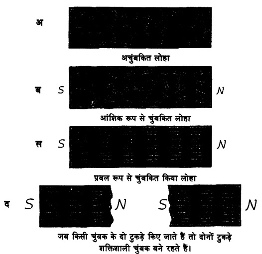 ब. थोड़ा-सा चुंबकित लोहे का टुकड़ा। लोहे के टुकड़े के पास चुंबक लाने पर ऐसी स्थिति बन सकती है। अगर पास में रखा गया चुंबक शक्तिशाली हो तो उसे हटाने के बाद भी लोहे के टुकड़े में कमजोर चुंबकत्व बना रहेगा।
