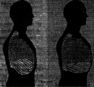 सांस लेना और छोड़नाः स्थिति-1 आराम की मुद्रा है; इसमें डायाफ्राम ऊपर की ओर उठा हुआ दिख रहा है। स्थिति-2 में सांस खींची जा रही है; इसमें पसलियां मांस पेशियों की मदद से ऊपर की ओर उठ रही हैं और डायाफ्राम नीचे की ओर खींचा जा रहा है। सांस छोड़ते समय फिर से स्थिति-1 को दोहराया जाएगा।