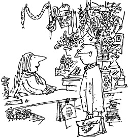 मेरा मतलब है कि सात लीग वाले जूतों का बस ड्रायवर के लिए क्या उपयोग? और यही वह चीज़ है जिसकी डाकिए को खास ज़रूरत है। या सोचिए कैसा गजब हो सकता है अगर ट्रेफिक पुलिस वाले को कोई अंधेरे का लबादा या अदृश्य होने वाली टोपी बेच दे। वह अदृश्य हो जाएगा और सारी कारें, लारियां और बसें उसे कुचलते हुए निकल जाएंगी। इसके अलावा कोई भी उसे हाथ उठाए नहीं देख पाएगा। परन्तु अदृश्य होने वाली टोपी खिड़की साफ करने वाले के लिए बहुत उपयोगी है क्योंकि इस तरह वह प्रकाश को रोके बिना खिड़कियां साफ कर सकेगा। और यह बड़े दर्जी की दुकान में काम करने वाले के लिए भी बहुत उपयोगी हो सकती है। वह स्वयं को अदृश्य बना स्त्री-पुरूषों के पुतलों को खिड़की में इधर-उधर सरका सकेगा। और जो भी उसे देखेगा, कहेगा ‘क्या चतुर यंत्र है।' और उनमें से कुछ लोग आकर नए कोट, पेंट, स्कर्ट, ब्लाउज़, टोप इत्यादि चीजें खरीद लेंगे।