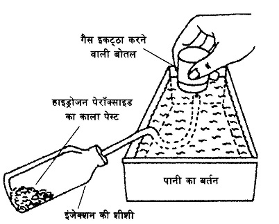 आवश्यक सामानः मैंगनीज़ ऑक्साइड, हाइड्रोजन पेरॉक्साइड, इंजेक्शन की शीशी, गैस इकट्ठा करने की बोतल और नली
