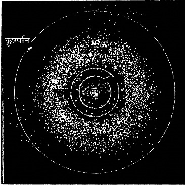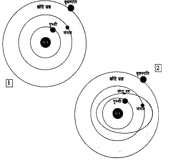 1. इस चित्र में सूरज की परिक्रमा करने वाले ग्रहों में से पृथ्वी, मंगल, बृहस्पति को दिखाया गया है। मंगल और बृहस्पति के बीच मौजूद छोटे ग्रहों की पट्टी भी दिख रही है। इस पट्टी में अब तक 7000 से भी ज्यादा छोटे ग्रह खोजे जा चुके हैं और इनकी संख्या दस हज़ार पार होने की संभावना है। अधिकांश छोटे ग्रह एस्टेरॉयड बेल्ट में रहते हुए ही सूर्य की परिक्रमा करते हैं इसलिए इनकी धरती से दूरी बनी रहती है।