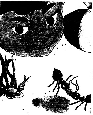 चूंकि मैंने उनके घर का एक हिस्सा बिगाड़ दिया था इसलिए मैंने चींटियों में एक हलचल पाई। मुझे बहुत बुरा लगा। मुझे लगा कि मुझे इसकी भरपाई कुछ अच्छा काम करके करनी होगी, नहीं तो वे मुझे अपना दुश्मन मान बैठेगी, जो मैं नहीं हूं। मैं सचमुच उनकी दोस्त था। अगले दिन मैं मिठाई का एक टुकड़ा, जो मां ने मुझे खाने के लिए दिया था, साल के पत्ते में लपेट स्कूल ले आया। स्कूल शुरू होने से पहले ही मैंने चींटियों की बाम्बी के पास मिठाई का टुकड़ा रख दिया। चींटियों को भोजन की तलाश में बहुत दूर जाना पड़ता होगा; आज उन्हें ऐन दहलीज पर खाना मिल जाएगा।