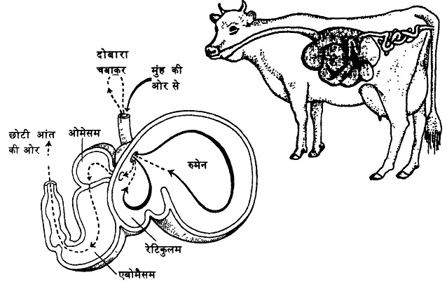 जब गाय घास खाती है तो उसे बिना चबाए रुमेन और रेटिकुलम में पहुंचा देती है, यहां सूक्ष्मजीव सेल्यूलोज़ को तोड़ते हैं और मेटाबोलाइज़ कर उन्हें सरल वसा अम्लों में तब्दील कर देते हैं। फिर इसे वापस गाय के मुंह में पहुंचाया जाता है। अब गाय इसे आराम से चबाती है। इसे जुगाली कहते हैं। जुगाली के समय वह इस लुगदीनुमा पदार्थ को महीन पीस देती है। तत्पश्चात इसे ओमैसम में पहुंचा दिया जाता है और वहां से एबोमैसम में।