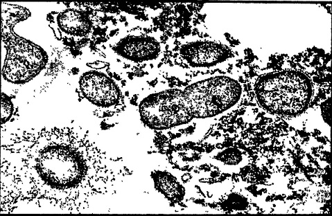 पाचन में बैक्टीरिया का सहयोगः गाय के रूमेन के भीतर का एक दृश्य। यहां बैक्टीरिया के चारों ओर अधपका भोजन दिखाई दे रहा है। रुमेन में बैक्टीरिया द्वारा छोड़े गए एंजाइम में भोजन का पाचन शुरू होगा। यह वातावरण बैक्टीरिया की वृद्धि के लिए एकदम भी है। चित्र के बीच वाले हिस्से में एक बैक्टीरिया, एक से दो होने की तैयारी में है।