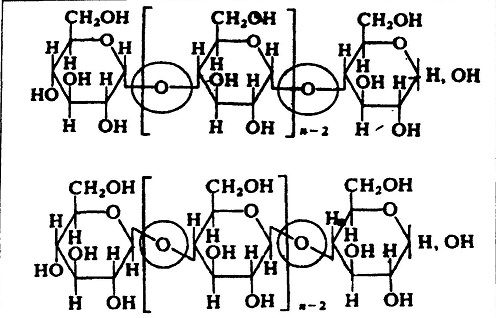 स्टार्च और सेल्यूलोज़ की बनावट: स्टार्च और सेल्यूलोज़ में वैसे तो काफी समानता है। लेकिन सिर्फ एक बंध (Bnd) में फर्क से सारा मामला ही बदल जाता है। जिन बंधों की वजह से सेल्यूलोज़ स्टार्च जैसा नहीं है उसे गोला लगाकर दिखाया गया है।