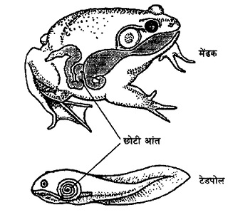 आंतों की लंबाई पर से एक उदाहरण याद आया - टेडपोल और मेंढक का। टेडपोल जो मेंढक की शुरुआती अवस्था है, एक शाकाहारी जीव होता है। इस अवस्था में टेडपोल की छोटी आंत काफी लंबी और जलेबी जैसी घुमावदार होती है। टेडपोल जब वयस्क अवस्था में प्रवेश करता है यानी मेंढक बनता है तो वह मांसाहारी बन चुको होता है। इसलिए इसकी छोटी आंत की लंबाई पहले की अपेक्षा काफी कम हो जाती है, साथ ही घुमाव भी कम हो जाते हैं। (अगले पृष्ठ पर चित्र देखिए)।