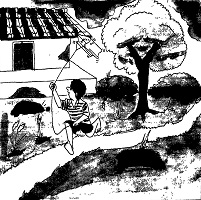 'सड़क पर मत जाना' यह तो बिम्म को रट गया था। आंगन में तुलसी का गमला, और चार दूसरे गमले रखे थे। ये सब ही आंगन की सारी जगह घेर लेते थे। इस भीड़-भाड़ में पतंगबाज़ी का क्या मज़ा आएगा। पिछवाड़े में एक खुली जगह थी जहां एक बड़ासा मकान था। वह मकान हमेशा बंद रहता था, आसपास चहार-दीबारी थी, काफी पेड़ थे। सब ओर काफी घास उग आई थी। इस ऊंची घास में बिम्म पैदल चल सके इतनी घुमावदार पगडंडी मौजूद थी।