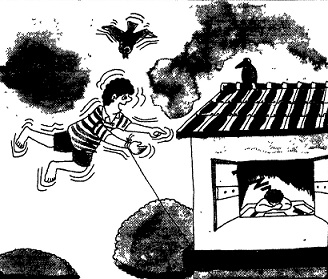 यह सब सुनकर मां ने कागज़ में एक छेद किया, धागा पिरोकर, उसमें गठान लगाई और दो-चार हाथ लम्बे धागे का छोर बिम्म के हाथों में थमाया। फिर बिम्म से बोली, "यह देखो बन गई तुम्हारी पतंग, लेकिन पतंग घर के आंगन में ही उड़ाना, बाहर सड़क पर मत जाना।''