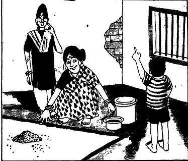 "अरे मां, बिम्म नीचे गिरे हुए फूल चुनकर लाया है और यह कहां के दादाजी गढ़ रहा है पता नहीं। निरा मूर्ख है।'' ऐसा कहते हुए बब्बी नाचने लगी।