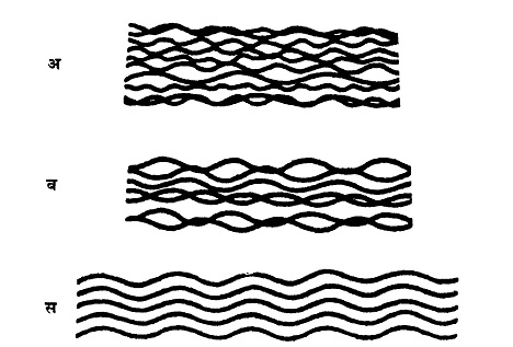 चित्र 'अ' असुसंगत प्रकाश किरण में अलग-अलग तरंगदैर्ध्य यानी तरंग लम्बाई की किरणें होती हैं जिसकी वजह से वे एक-दूसरे की दोलन स्थितियों (phase) से तालमेल नहीं बैठा पाती। चित्र 'ब' एक जैसी तरंग लंबाई की तरंगें भी दोलन स्थिति (phase) के मामले में एक-दूसरे में फर्क या अमुर्मगत हो सकती हैं। चित्र 'स' लेज़र किरणें समान लंबाई की होने के साथ-साथ दोलन स्थिति के मामले में भी एक जैसी होती है, यानी वे सुसंगत होती हैं।