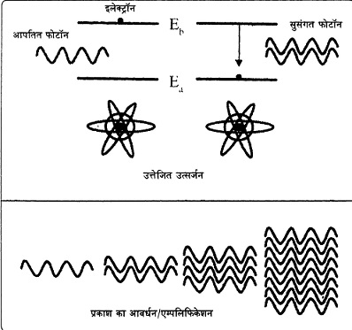 अब मान लीजिए हम एक-दूसरे से समानता रखने वाले परमाणुओं के इलेक्ट्रॉन एक निश्चित ऊर्जा स्थिति स्तर पर ले जाएं और फिर उन परमाणुओं के समूह से उत्तेजित उत्सर्जन करवाया जा सके। ऐसे खास ऊर्जा वाले फोटॉन उनपर दागे जाएं तो क्या होगा? सबसे पहले तो एक परमाणु के उत्तेजित उत्सर्जन से दो सुसंगत फोटॉन बनेंगे, वे दोनों दो और परमाणुओं से टकराएंगे और उनसे चार फोटॉन निर्मित होंगे, उन चार से आठ, आठ से सोलह... इस तरह सुसंगत फोटॉन का काफी विशाल उत्तेजित उत्सर्जन निर्मित होने की वजह से और भी सुसंगत फोटॉन्स के बाहर निकलने की संभावना बढ़ जाती है।