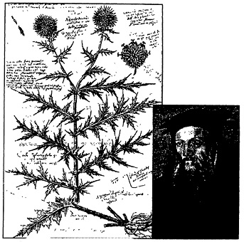 साथ में उसके द्वारा बनाया इकिनोप्स स्फेरोसिफेल्म (Echinops Spherocephlus) का स्केच।