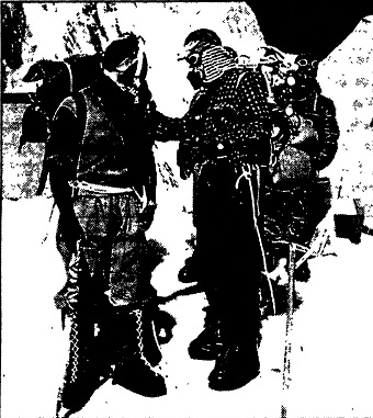 ऑक्सीजन उपकरण की जांच-पड़तालः 1953 के एवरेस्ट अभियान के दौरान एवरेस्ट शिखर में कुछ भी फीट नीचे हिलेरी, तेनजिंग के ऑक्सीजन उपकरण की जांच करते हुए। इसमें पहले कई पर्वतारोहियों के साथ ऐसा भी हुआ कि उनके ऑक्सीजन देने वाले उपकरण ऐन मौके परे दगा दे गए और उन्हें मायूस होकर लौटना पड़ा। हिलेरी ऐसा कोई भी जोखिम नहीं उठाना चाहता था। बाद में अपने एवरेस्ट के संस्मरणों में हिलेरी ने बताया कि एवरेस्ट की निर्णायक चढ़ाई से पहले उन्होंने ऑक्सीजन की खपत और ऑक्सीजन की उलब्धता का कई बार हिसाब लगाया था।