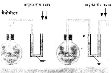एक उपकरण होता है मैनोमीटर। इससे किसी भी पात्र में भरी गैस का दबाव नापा जा सकता है। एक नली में पारा भरा है। एक ओर से नली खुली है और वायुमंडल के संपर्क में है। दूसरी ओर नली को उस पात्र से जोड़ते हैं जिसकी गैस का दबाव पता करना है। यदि गैस का दबाव वायुमंडल के बराबर है तो नली में दोनों ओर पारे का तल बराबर रहेगा। मगर यदि गैस का दबाव ज्यादा है तो पारा दूसरी ओर की नली में थोड़ा ऊपर रहेगा। अब मान लीजिए वायुमंडल वाली नली को घुमाकर उसका मुंह नीचे की ओर कर दें।