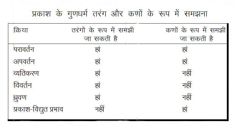 नीचे हम प्रकाश की अलग-अलग घटनाओं की तुलनात्मक तालिका दे रहे हैं। प्रकाश कणों से बना है या तरंगों से? यदि हम प्रकाश की अलग-अलग क्रियाओं को ध्यान से देखें तो ऐसा लग सकता है कि हम कह सकते हैं कि प्रकाश तरंगों से बना है।