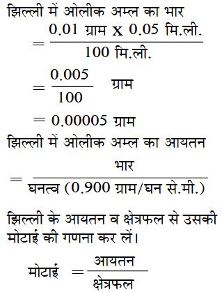 हमने माना है कि यह झिल्ली एक अणु मोटी है। अत: इसकी मोटाई ओलीक अम्ल के एक अणु की मोटाई है। हमने यह भी माना है कि अणु घनाकार हैं। अत:अणु की मोटाई के आधार पर एक अणु के आयतन की गणना की जा सकती है।