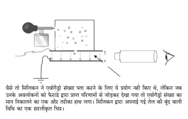 खैर अपने विषय पर लौटें। फैरेडे के नियम से हम जानते हैं कि किसी तत्व का 1 ग्राम तुल्यांक जमा करने के लिए 96,500 कूलंब विद्युत की ज़रूरत होती है। यानी यदि एक आवेश वाले आयन जमा हो रहे हैं, तो तुल्यांक भार और अणु भार बराबर होगा। अर्थात 96,500 कूलंब से एक मोल तत्व जमा हो जाएगा। इसका यह भी मतलब है कि 96,500 कूलंब एक मोल इलेक्ट्रॉन के बराबर है। अब यदि आपको एक इलेक्ट्रॉन का आवेश मालूम हो, तो आप एक मोल में इलेक्ट्रॉन की संख्या निकाल सकते हैं।