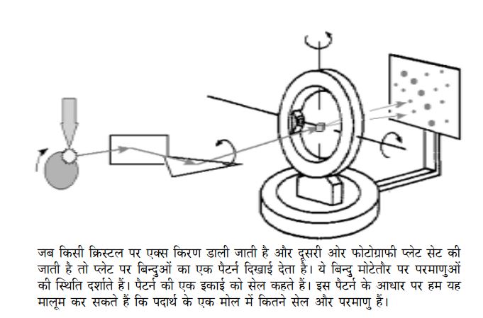 एक्स किरण विवर्तन की मदद से हम यह पता लगा सकते हैं कि किसी क्रिस्टल की एक सेल कितनी बड़ी है और इस एक सेल में कितने परमाणु हैं। इसके आधार पर यह पता लगाना मुश्किल नहीं है कि उस पदार्थ के एक मोल में कितनी सेल होंगी और कुल कितने परमाणु होंगे। एक उदाहरण से बात को समझते हैं।जैसे सोडियम क्लोराइड को ही लेते हैं। रवेदार नमक का घनत्व 2.169 ग्राम प्रति घन से.मी. है। इसका अणु भार 58.45 है। एक्स किरण विवर्तन से पता चलता है कि इसकी क्रिस्टल संरचना अगले पृष्ठ पर दिए गए चित्र जैसी होती है। इसमें बड़े काले गोले सोडियम तथा छोटे सफेदे गोले क्लोरीन के परमाणु के द्योतक हैं। चित्र में सोडियम क्लोराइड क्रिस्टल के चार सेल दिखाए गए हैं।