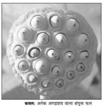 एक फूल, अनेक अण्डाशय - एक संयुक्त फलपुंजफल या संयुक्त फल ऐसे फूलों से बनते हैं जिनमें फूल के पुष्पासन पर एक से अधिक स्त्रीकेसर स्वतंत्र रूप से लगे होते हैं। इन फूलों के प्रत्येक अण्डाशय से छोटे-छोटे फल बनते हैं जो एक ही डण्ठल पर लगे होते हैं जैसे कमल, अकाव, शरीफा आदि। कमल गट्टे में प्रत्येक फल अलग-अलग होता है लेकिन शरीफा यानी सीताफल में फूल की अवस्था में तो पुष्प दण्ड पर अण्डाशय अलग-अलग होते हैं परन्तु फल बनते-बनते और पकते-पकते ये आपस में जुड़ जाते हैं और बाहर से देखने पर एक ही फल नज़र आता है। परन्तु यह एक संयुक्त फल है, इसका पता फल पर स्थित आँखों से (फल की सतह पर उभरी हुई रचनाएँ) लगाया जा सकता है। दरअसल, बोलचाल में हम जिसे आँख कहते हैं वे इस फल के अण्डाशय हैं। अत: प्रत्येक आँख एक फल है जिसमें एक काले रंग का बीज होता है। अत: जब हम सीताफल खाते हैं तो हमारे हाथ में एक संयुक्त फल होता है जिसमें से हम एक-एक, छोटा-छोटा फल निकाल कर खाते हैं।
