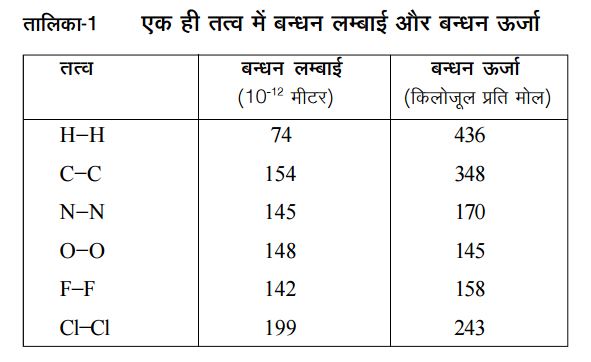 जैसे उन बन्धनों को देखें जो एक ही तत्व के दो परमाणुओं के बीच बनते हैं। तालिका-1 में कुछ तत्वों के बारे में जानकारी दी गई है। तालिका में उस बन्धन की लम्बाई भी दी गई है। बन्धन की लम्बाई से तात्पर्य यह है कि जब वह बन्धन बनता है तो दो परमाणु औसतन कितनी दूरी पर होते हैं। आमतौर पर देखा गया है कि बन्धन लम्बाई जितनी अधिक होगी बन्धन ऊर्जा उतनी कम होगी।