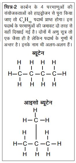 इसी गुण के कारण कार्बन के यौगिकों में एक और अनोखी बात सामने आती है। चूँकि कार्बन शाखित हो सकती हैं, इसलिए तत्वों के एक ही अनुपात या एक ही अणु सूत्र के साथ एक से अधिक संरचनाएँ बन सकती हैं (और बनती हैं)। जैसे ऊपर हमने 4 कार्बन का उदाहरण देखा। यदि इसमें कार्बन की शेष बची समस्त संयोजकताओं की पूर्ति हाइड्रोजन से की जाए तो हमें जो पदार्थ प्राप्त होगा, उसका अणु सूत्र होगा C4H10 मगर इस पदार्थ के परमाणु दो तरह से व्यवस्थित हो सकते हैं। (चित्र-2)