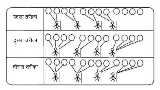 अब सवाल था कि बच्चों को बाँटने के चिन्ह से कैसे परिचित करवाऊँ। अचानक ही उन्हें कोई नया चिन्ह दे दिया जाए, यह भी ठीक नहीं। मुझे अचानक सूझा कि बच्चों को शायद जोड़ की क्रिया से आगे लाना चाहिए। हालाँकि जोड़ की क्रिया और बाँटने की क्रिया दोनों अलग-अलग हैं परन्तु बच्चों में चिन्ह की पहचान और उसकी जिज्ञासा जगाने के लिए मुझे यह रास्ता अपनाना ठीक लगा। मैंने अपनी बात जारी रखी।