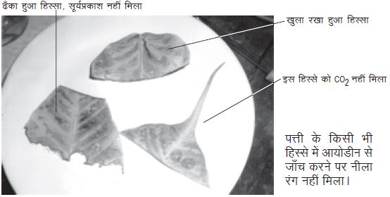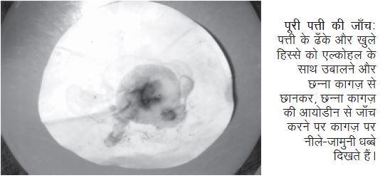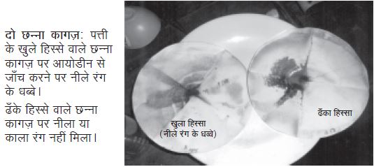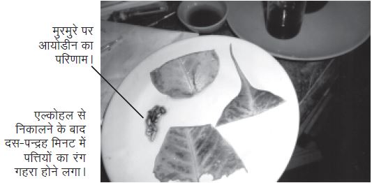 पाठ्यपुस्तक में आगे बताया गया था कि एल्कोहल में उबालने से पत्ती सफेद या भूरे रंग की हो जाती है। उस पर आयोडीन की कुछ बूँदें डालते ही पत्ती का ढँका भाग वैसा ही रहेगा लेकिन खुला हिस्सा काला-नीला होगा। साथ ही, इस प्रकार का चित्र हमारी पाठ्यपुस्तक में भी दिया गया था।