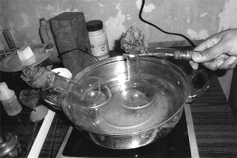 पत्ती से हरा रंग हटाने के लिए एक कटोरी में एल्कोहल लेकर उसमें पत्ती डाली और स्टोव पर पतीली में पानी लेकर, यह कटोरी रखी। यह सब करना कैसे है इस पर पाठ्यपुस्तक कुछ नहीं कहती, किताब में सिर्फ वॉटर बाथ में रखने के लिए कहा गया है। इस प्रकार करने से बार-बार वाष्पीकृत होने के कारण एल्कोहल भी काफी खर्च हो रहा था। मेरे ख्याल से मैंने कम-से-कम 500 मि.ली. एल्कोहल इसमें खर्च किया होगा। मैं यह मानकर चल रही थी कि हरा रंग हटाने की क्रिया 10-15 मिनट में हो जाएगी लेकिन इसमें एक घण्टे से अधिक समय लगा।