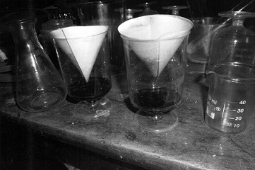 मैं सोच रही थी, आखिर इस खुले हिस्से का स्टार्च गया कहाँ। इतने में मेरा ध्यान बीकर पर गया जिसमें मैंने पत्ती को एल्कोहल में उबाला था। बीकर में नीचे कुछ सफेद परत जमा दिख रही थी। मैंने अनुमान लगाया, शायद यह स्टार्च होगा। इसलिए उस एल्कोहल को छन्ने कागज़ से छान लिया। कागज़ को सूखने दिया और बाद में उस पर आयोडीन की बूँदें डालीं तो उस पर गहरे नीले, जामुनी रंग के धब्बे दिखाई देने लगे।