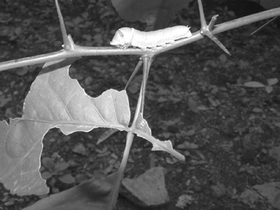 लगभग छिंगली अँगुली के बराबर मोटाई की इल्ली। एक कुतरी हुई पत्ती की निचली सतह पर शंखी चिपकी हुई दिखाई देगी। चित्र में सफेद घेरे में दिख रही है यह।