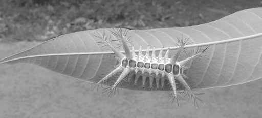 अब तक यह समझ में आ चुका था कि यह किसी तितली का लार्वा (केटरपिलर) है। ध्यान से देखा तो पाया कि छोटे लार्वा के शरीर पर पाई जाने वाली काँटे जैसी रचनाएँ नरम होती हैं मगर बड़े लार्वा में ये कड़क और काले रंग के हो जाते हैं। ज़रा सावधानी से इन काँटों को छुआ तो पाया कि ये काफी नुकीले हैं। अब हमारे सामने यह जानने की चुनौती थी कि आखिर इसका सिर किस तरफ है। दरअसल, हमें लार्वा के दोनों ही सिरों पर नुकीले उपांग बराबर की संख्या में मिले। आप स्वयं ही देखें कि दोनों सिरों पर दो-दो जोड़ी उपांग और इन पर खूब सारी काँटे जैसी रचनाएँ। हमें लगा कि यह भी एक अजीब पहेली है। इस लार्वा के दुश्मनों के लिए यह पता करना आसान नहीं होगा कि आखिर मुँह किस दिशा में है।