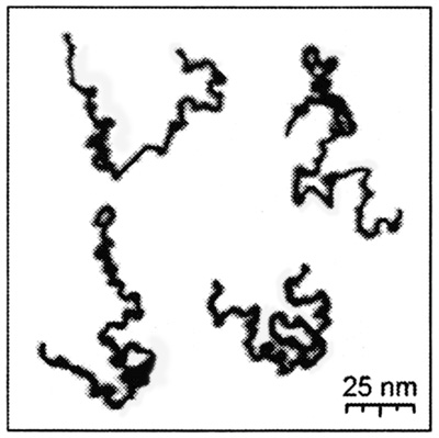 चित्र-2 में 0.2 माइक्रॉन लम्बाई के बहुलकों की  ाृंखला दिखाई गई है। ये कई आकार के तथा कई तरह से मुड़े हुए होते हैं। इन बहुलकों की मोटाई 0.0004 माइक्रॉन होती है जो कि उनकी लम्बाई से कई गुना छोटी है। चित्र में ‘25 दथ्र्’ लेबल, नीचे दिया गया स्केल दर्शाता है; 25 दथ्र् उ 0.025 माइक्रॉन। बहुलक का सिरा किसी प्रकाशदीप्त रंजक की चिप्पी लगाकर दर्शाया जा सकता है। कभी-कभी बहुलक उसके मुड़े हुए स्वरूप से सीधे खिंचे हुए रूप में आ जाता है। उसके सिरों पर चिप्पी लगाने से हमें दो सिरों की दूरी में, पहले और बाद में आए अन्तर का पता लगाना सम्भव हो पाता है।
