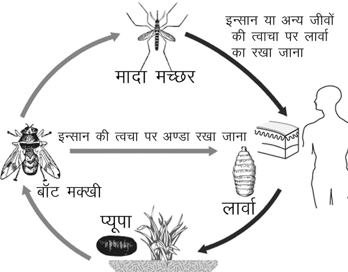 बॉट मक्खी जीवनचक्र: बॉट मक्खी अपने अण्डे स्वयं इन्सान या किसी अन्य जीव की त्वचा पर छोड़ देती है। लेकिन उष्णकटिबन्धीय इलाकों में बॉट मक्खी अण्डों को सही जगह पहुँचाने के लिए मादा मच्छर का एग-कैरियर की तरह उपयोग करती है। लार्वा तयशुदा मियाद के बाद त्वचा छोड़कर प्यूपा और फिर वयस्क बॉट मक्खी बनता है।