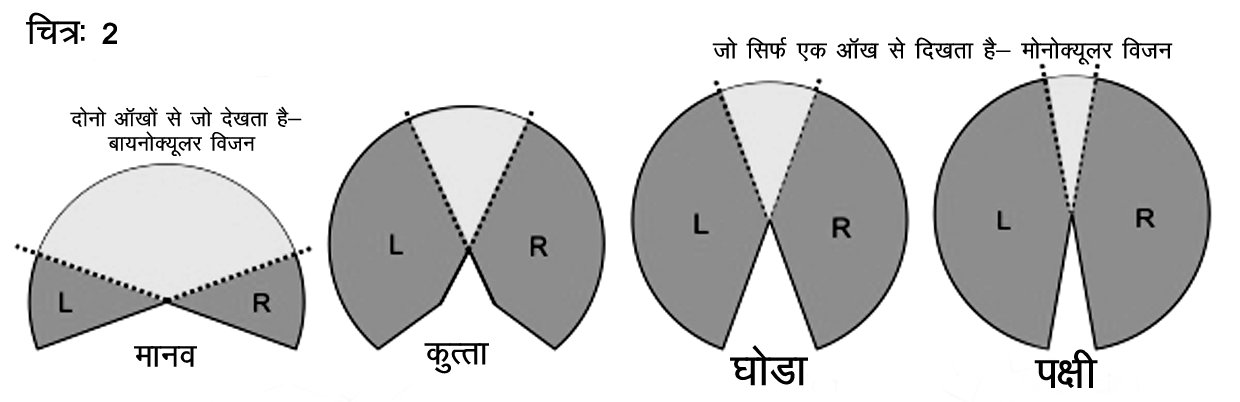 इस तरह उल्लू रात के अँधेरे में भी, बहुत ही कम रोशनी में देख पाते हैं। उल्लुओं की आँखों की कुछ अन्य विशेषताएँ भी हैं। अन्य पक्षियों जैसे उल्लुओं की आँखें सिर के दाईं-बाईं ओर स्थित नहीं होतीं; बल्कि चपटे चेहरे पर सामने की तरफ होती हैं (चित्र-1)। और उल्लू अपनी आँखों को हिला-घुमा नहीं सकते। रास्ते पर खड़े आते-जाते लोगों को कुछ हद तक हम सिर्फ अपनी आँखें यानी आँखों की पुतलियाँ फेरकर भी देख सकते हैं। उल्लू ऐसा नहीं कर सकते। सामने की तरफ अगर नज़र केन्द्रित करते हैं, तो कई जानवरों की तुलना में उल्लू का दृष्टि-क्षेत्र (field of vision, बिना सिर या गर्दन घुमाए जितना इलाका नज़र आता है) सबसे कम है (चित्र-2, 3)।