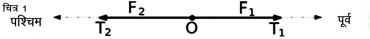 इन दो बलों की व्यवस्था को समझने के लिए चित्र-1 में दिखाए अनुसार हम मान सकते हैं कि एक टेबल पर एक बिन्दु O है और इस बिन्दु की एक तरफ, टेबल के सपाट तल में, F1 बल लग रहा है व पहले बल की दिशा के विपरीत F2. रस्साकशी से तुलना करें तो F1 एक और F2 दूसरी टीम के द्वारा लगाया गया बल है। बिन्दु O रस्सी पर कोई भी एक बिन्दु हो सकता है। आसानी के लिए हम यह भी मान लेते हैं कि बल F1 बिन्दु T1 से पूर्व की ओर लग रहा है और F2 बिन्दु T2 से पश्चिम की ओर। अब जैसा कि हमने देखा, अगर F1=F2 होगा तो बिन्दु O की टेबल पर स्थिति ज्यों की त्यों बनी रहेगी। अगर F1 या F2 में से कोई भी दूसरे की तुलना में ज़्यादा हुआ तो बिन्दु O उस बल की दिशा में खिसकता चला जाएगा। खैर, इन दो बलों का मान जो भी हो बिन्दु O हमेशा T1 व T2 को जोड़ने वाली रेखा पर ही रहेगा और सिर्फ उस पर ही नज़र रखकर हम यह बता सकते हैं कि तंत्र सन्तुलित है या नहीं।