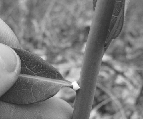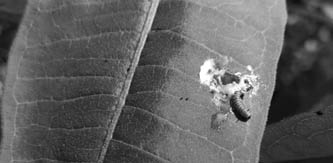 चित्र 1 : मिल्कवीड की पत्ती को खाने पर उससे निकले लेटैक्स में फंसी इल्ली.