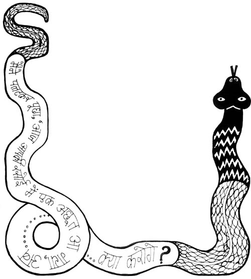 मगर आज मैंने स्थिति को थोड़ा कम करके आँका था। जैसे ही मैंने छड़ी से साँप को दबाने की कोशिश की, वह फुफकारता हुआ उठा। मैं झूठ नहीं कह रहा हूँ। वह खूब लम्बा था, मेरे बराबर लम्बा। जीभ लपलपा रहा था। उसका फन फैला हुआ था, बहुत खतरनाक दिख रहा था। ‘मारो’, मेरी आवाज़ डर के मारे काँप रही थी। कोई जवाब नहीं। मैंने सिर घुमाकर एक नज़र डाली तो पता चला कि वे तीनों रसोई से बाहर निकलकर बरामदे के दूसरी ओर भाग गए थे।