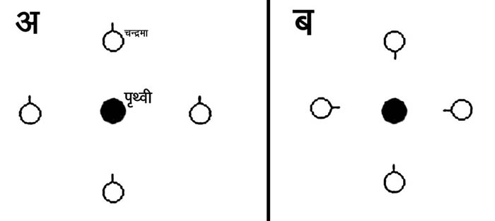 चित्र : 1 चन्द्रमा पृथ्वी की परिक्रमा करते हुए अपने अक्ष पर भी घूमता है और इसलिए हमें चन्द्रमा का एक ही आयाम दिखता है. (अ) अगर चंद्रमा अपने अक्ष पर नहीं घूमता तो हमें इस चित्र के अनुसार अलग अलग समय पर अलग अलग चेहरे दिखाई देते. (ब) पृथ्वी से हमें केवल एक हिस्सा ही दिखाई देता है क्योंकि पृथ्वी का चक्कर कटते हुए चंद्रमा अपने अक्ष पर भी एक बार घूम जाता है.