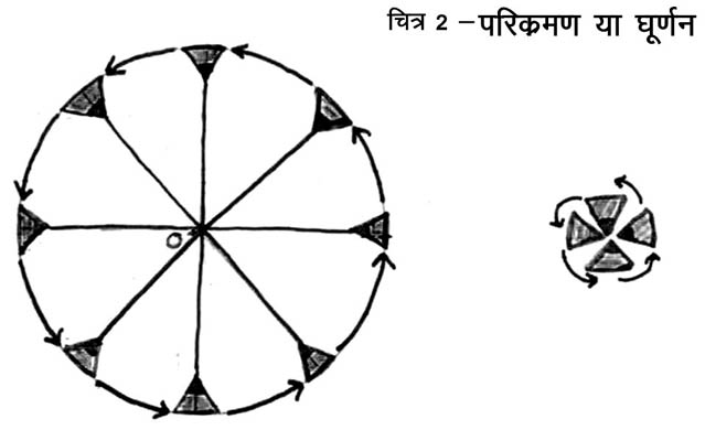 इस प्रक्रिया में यदि वस्तु की स्थिति को देखें तो यह अपने अक्ष पर भी घूमी और चित्र-2 के बिन्दु ‘ग्र्’ के चारों ओर भी। ऐसा एक ही समय अन्तराल में हो रहा था। अब सदन में परिक्रमण और घूर्णन की समझ बन रही थी और मुझे अपना काम आसान लगने लगा था। यह बताते हुए कि चन्द्रमा का परिक्रमण काल लगभग 27 1/3 दिन व घूर्णन काल लगभग 29 1/2 दिन का होता है जिसके कारण हम चन्द्रमा का लगभग 58% हिस्सा देख पाते हैं, मैं अपना काम पूरा हुआ समझ रही थी।