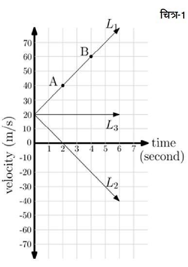 (1) लाइन L1: चलिए झट से इस लाइन की y-अन्त:-खण्ड व ढलान2 निकाल लेते हैं। इस लाइन के लिए y-अन्त:-खण्ड होगा 20। लेकिन बस यह बतला देना तो काफी न होगा। यह 20 की संख्या क्या दर्शा रही है ये भी बतलाना होगा और उसके लिए सबसे आसान तरीका है कि इस संख्या को इसकी इकाई के साथ बतलाया जाए जोकि है m/s. तो इस तरह लाइन L1 के लिए y-अन्त:-खण्ड होगा u = 20 m/s. यानी कि जिस क्षण से हमने वस्तु की गति का अध्ययन शुरू किया उस क्षण वस्तु का वेग 20 m/s था। जिसके मायने हुए कि समय t = 0 सेकण्ड पर वस्तु 20 m/sकी रफ्तार से आगे की ओर बढ़ रही थी। इस शुरुआती क्षण के बाद वस्तु के इस वेग में क्या परिवर्तन हुआ यह वेग-समय ग्राफ की ढलान पर निर्भर करेगा। L1 की ढलान इस लाइन पर किसी भी दो बिन्दुओं को लेकर निकाल सकते हैं। अगर इस दर को a से दर्शाएँ व लाइन L1 पर दो बिन्दु A(2, 40) व B(4, 60) लें तो लाइन की ढलान होगी: