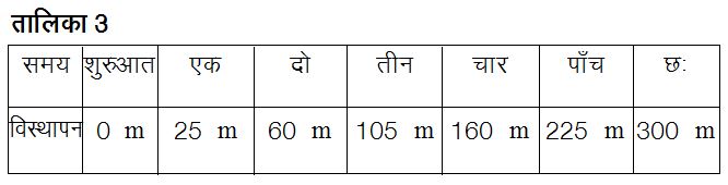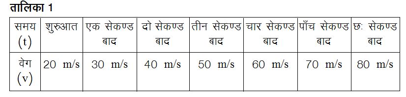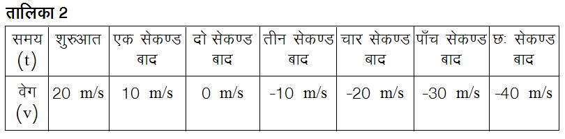 इस समीकरण में द्य के अलग-अलग मान रखने पर हमें तालिका 2 में दर्शाए वेग ही मिलते।क्या आपने ऐसी किसी गति का अवलोकन किया है जिसमें वस्तु का वेग आगे बढ़ते हुए घटता जाए और फिर किसी क्षण शून्य हो जाए, जिसके बाद वस्तु विपरीत दिशा में गति करने लगे व उसका वेग इस विपरीत दिशा में लगातार बढ़ता जाए? मुझे तो पूरा यकीन है कि आपने ऐसी गतियाँ ज़रूर देखी होंगी। ज़रा सोचिए। पहले व दूसरे, दोनों मामलों में त्वरण पूरी गति के लिए समान है, इसलिए ऐसी गतियाँ एकसमान त्वरित गति का उदाहरण हैं।