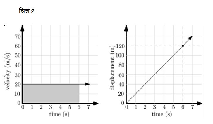इतनी बातचीत के बाद एक जायज़ सवाल बनता है कि वेग और त्वरण तो ठीक है, लेकिन वस्तु ने इन गतियों के दौरान दूरी कितनी तय की या सन्दर्भ बिन्दु से उसकी दूरी कितनी थी? आखिरी मामले के लिए जिसमें त्वरण शून्य यानी कि गति एकरूप वेग की गति है, इन दूरियों को निकालना बहुत आसान होगा। हम इस सीरीज़ के दूसरे भाग (गति के ग्राफ और लाइनें, संदर्भ अंक-105) में देख चुके हैं कि एकरूप वेग से चलने वाली वस्तु एक निश्चित दिशा में बराबर समय अन्तराल या अवधि में समान दूरी तय करती है। यानी कि अगर वस्तु 20 m/s के एकरूप वेग से आगे बढ़ रही है तो हर एक सेकण्ड में वह धनात्मक दिशा में 20 m की दूरी तय करेगी - एक सेकण्ड बाद 20 m, दो सेकण्ड बाद 40 m व इसी तरह द्य सेकण्ड बाद 20 mt की दूरी तय कर चुकी होगी। अगर वस्तु की शुरुआती स्थिति को ही सन्दर्भ-बिन्दु मानें तो द्य सेकण्ड के बाद वस्तु की सन्दर्भ-बिन्दु से दूरी भी धनात्मक दिशा में 20 mt के ही बराबर होगी। साफ ज़ाहिर है कि अगर एकरूप वेग u हो तो द्य समय में वस्तु की सन्दर्भ-बिन्दु से दूरी यानी कि विस्थापन होगा ut. क्या हम इस विस्थापन को वेग-समय ग्राफ पर देख सकते हैं? आइए देखते हैं। 20 m/s के एकरूप वेग से चल रही वस्तु के लिए वेग-समय व विस्थापन-समय ग्राफ चित्र-2 में दिखाए गए हैं।जैसा कि हमने देखा कि 20 m/s के एकरूप वेग से गति कर रही वस्तु सन्दर्भ-बिन्दु से द्य सेकण्ड में 20 mt की दूरी से विस्थापित होगी। इस विस्थापन को हम एक ऐसे आयत के क्षेत्रफल के रुप में भी देख सकते हैं जिसकी चौड़ाई 20 व लम्बाई t है। क्या आप इस आयत को वेग-समय ग्राफ पर देख सकते हैं? t = 6s के लिए चित्र-2 के वेग-समय ग्राफ पर इस आयत को दर्शाया गया है। समय के अक्ष व एकरूप वेग की गति को दर्शा रही लाइन के बीच बने इस आयत के क्षेत्रफल का मान 120 होगा जो 6 s बाद वस्तु के विस्थापन 120 m के बराबर है। क्योंकि इस मामले में वस्तु के चलने की दिशा नहीं बदल रही इसलिए विस्थापन का मान वस्तु के द्वारा तय की गई दूरी के बराबर ही होगा। ऐसे में वस्तु की गति के लिए चाल-समय ग्राफ ठीक वेग-समय ग्राफ जैसा व वस्तु के द्वारा तय किया गया दूरी-समय ग्राफ ठीक विस्थापन-समय ग्राफ के जैसा ही होगा (बनाकर देखिए)।