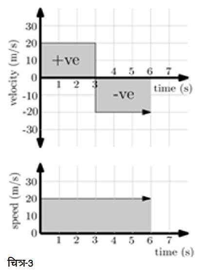 एकरूप वेग का एक और मामला देखते हैं जिसमें वस्तु पहले तीन सेकण्ड आगे की ओर 20 m/s के एकरूप वेग से चली और फिर बिना वक्त गवाए अगले तीन सेकण्ड 20 m/s के एकरूप वेग से पीछे की ओर चली। साफ तौर पर पहले तीन सेकण्ड वस्तु का वेग होगा +20 m/s व अगले तीन सेकण्ड -20 m/s। चित्र-3 में वेग-समय व चाल-समय ग्राफ पर इस मामले को दर्शाया गया है। इस मामले में पहले तीन सेकण्ड में वस्तु आगे की ओर 60 m की दूरी तय करेगी व फिर अगले तीन सेकण्ड विपरीत दिशा में 60 m. कुल मिलाकर वस्तु के द्वारा तय की गई दूरी इस मामले में भी 120 m ही होगी व वस्तु के द्वारा तय की गई दूरी व समय के बीच का ग्राफ भी चित्र-2 के दूरी-समय ग्राफ जैसा ही होगा। लेकिन इस मामले में 6 s के बाद वापस वस्तु उसी जगह पर होगी जहाँ से उसने शुरुआत की थी। अगर वस्तु की शुरुआती स्थिति पर ही सन्दर्भ-बिन्दु लें तो क्या आप वस्तु की सन्दर्भ-बिन्दु से दूरी (विस्थापन) व समय के बीच का ग्राफ बना सकते हैं? लेख के अन्त में दिए चित्र-7 में इस सवाल का जवाब देखने से पहले कोशिश कीजिए इसे बनाने की।इस चर्चा से जो बात निकलकर आती है वो यह कि एकरूप वेग की किसी गति के वेग-समय ग्राफ व चाल-समय का क्षेत्रफल क्रमश: वस्तु के विस्थापन व तय की गई दूरी के बराबर होता है।