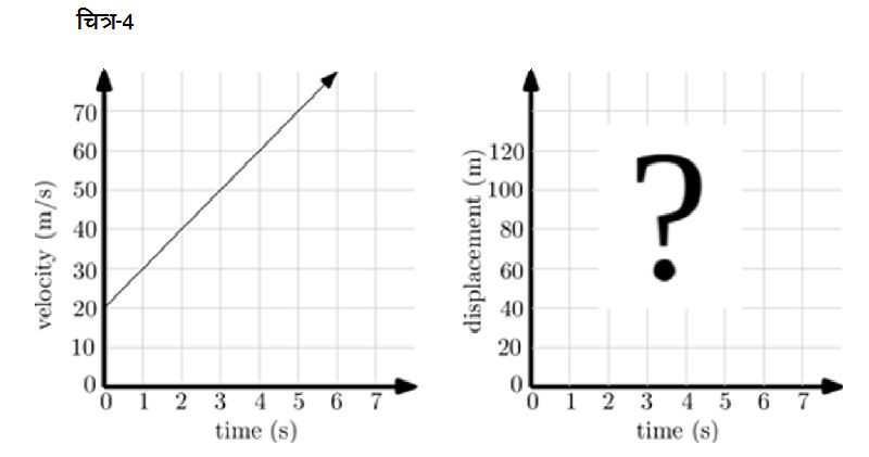 क्या इस सवाल का जवाब ढूँढ़ने के लिए हमारे पास कोई संकेत हैं? हाँ - अगर हम यह मान लें कि एकरूप गति के चित्र-2 वाले मामले की ही तरह चित्र-4 के वेग-समय ग्राफ में भी समय के अक्ष व गति को दर्शा रही लाइन के बीच का क्षेत्रफल वस्तु के विस्थापन के बराबर होगा! गैलीलियो ने सत्रहवीं शताब्दी में लगभग ऐसी ही3 अवधारणा मुक्त रूप से एकसमान त्वरण के प्रभाव में गिर रही एक वस्तु की गति की व्याख्या करने के लिए बनाई व अपने प्रयोगों से इसे सही भी पाया। तो हम भी इस अवधारणा को सही मानकर आगे बढ़ते हैं कि वेग-समय ग्राफ का क्षेत्रफल विस्थापन के बराबर होगा। आप चाहें तो गैलीलियो की तरह इस लेख के अन्त में सुझाया गया प्रयोग कर इस अवधारणा की जाँच कर सकते हैं।