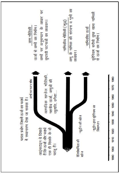 - हाँ, कई मायनों में यह एकदम उल्टा है। इस बिन्दु को और भी स्पष्ट तरीके से समझने के लिए चित्र-3 की मदद ले सकते हैं जिसमें 19वीं शताब्दी के अन्त से न्यूक्लियर फिज़िक्स यानी कि नाभिकीय भौतिकी के क्षेत्र में हुए विकास को दर्शाया गया है।