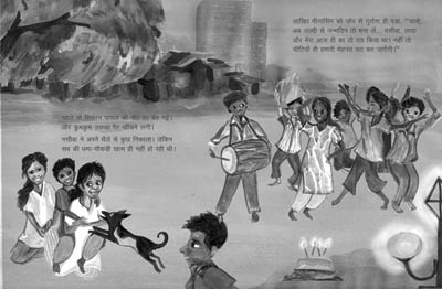 इस किताब के चित्रों के रंग बहुत कुछ सोचने पर मजबूर करते हैं। ऐसा तो नहीं कि मैंने ये रंग पहले कभी नहीं देखे। पर हाँ, बच्चों की किताबों में कम ही देखे हैं। अगर देखे भी हैं तो, अक्सर यह लगा कि ये गहरे स्लेटी रंग केवल निगेटिव परिस्थितियों और पात्रों के लिए इस्तेमाल होते आ रहे हैं। पर यही तो रंग हैं जो मैं दिल्ली की धूल भरी सड़कों पर देखती हूँ, यही तो हैं वे जिन्हें मैं रोज़ अपनी मेज़, लैपटॉप, टी.वी. और खिड़कियों पर से पोंछ-पोंछकर मिटा देने की कोशिश करती हूँ। और रोज़ वे एक हक के साथ फिर वहीं अपना डेरा जमा लेते हैं। ये वही रंग हैं जिन्हें हम अपने शहरों से दफा कर देना चाहते हैं, जिन्हें हम गन्दगी, मैल, अछूत, गँवार, बेकार की उपाधि देते हैं।