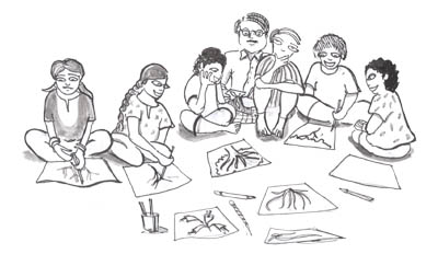 कक्षा-1 से कक्षा-5 तक के कुल 22 बच्चे कक्षा में मौजूद थे। बच्चों से आपसी परिचय के बाद माहौल थोड़ा अनौपचारिक हो चला था। मैं कक्षा को पूर्व निर्धारित नहीं करना चाहता था सो बच्चों से ही पूछ लिया कि आज हम क्या करेंगे। बच्चे चहक उठे कि ड्रॉइंग बनाएँगे। मैं गोल घेरे में बच्चों के बीच ही बैठ गया। एक बच्चे ने कॉपी, पेंसिल और रबर मुझे थमाते हुए कहा, “हम आपको बताएँगे कि क्या बनाना है।” “पहले आप बनाएँगे फिर हम अपनी-अपनी कॉपियों में बनाएँगे।” इस तरह से सभी बच्चे मेरे शिक्षक बन गए, और मैं कक्षा का विद्यार्थी।