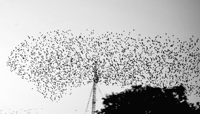 एक शहर में शाम का दृश्य! घनी आबादी और भीड़-भाड़ वाले इलाके में चिड़ियाओं का आगमन सूरज के ढलने के साथ शुरु हो जाता है। एक छोटा झुण्ड पूरब से आया, एक उत्तर से और दोनों ने मानो इशारों-इशारों में कुछ कहा और एक साथ आसमान में उड़ने लगे। यही क्रम जारी है। चारों ओर से चिड़ियाएँ छोटे-छोटे झुण्डों में आती-जाती हैं और फिर एक बड़ा झुण्ड बनाती हैं। झुण्ड में और छोटे झुण्ड शामिल होते जाते हैं... और यह क्रम जारी रहता है। फिर बड़े झुण्ड आसमान में कलाबाज़ियाँ करते हुए चक्कर लगाने लगते हैं। इस झुण्ड में अनगिनत चिड़ियाएँ हैं। जब छोटे-छोटे झुण्ड एक बड़े झुण्ड में मिलते हैं तो चिड़ियाओं में आपसी टकराहट नहीं होती। झुण्ड की चिड़ियाओं में लय दिखाई देती है मानो कोई झुण्ड को नियंत्रित कर रहा हो। तरह-तरह के चित्र बनाती हैं ये चिड़ियाएँ आसमान में, कभी मछली का आकार तो कभी लहरदार लहरिया! मानो आसमान में काली रंग की धुन्ध छा गई हो। सिर के ठीक ऊपर का आसमान जो कि नीला था वह अब नीला-काला बन चुका है। पश्चिम में ललिया रहे आसमान का यह दृश्य खूब सुहावना लगता है। कोई इन्हें देखकर उदासीन नहीं रह सकता। लगता है मानो चिड़ियाओं का मेला लगा हो।