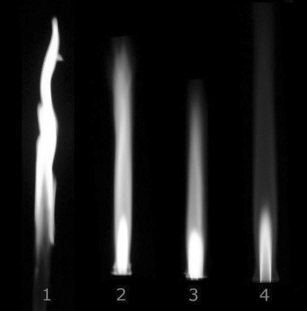 आम तौर पर रसायनों को गर्म करने के लिए स्कूल प्रयोगशालाओं में बुनसन बर्नर प्रयोग किया जाता है। इसमें ईन्धन के रूप में प्राकृतिक गैस मीथेन का इस्तेमाल किया जाता है जो एक प्रकार का हाइड्रोकार्बन है। वैसे आजकल बुनसन बर्नर में एलपीजी भी ईन्धन के रूप में इस्तेमाल होने लगी है। इस बर्नर में कुछ छेद होते हैं जो पूर्ण या अपूर्ण दहन के लिए ज़िम्मेदार होते हैं। नीचे दिए चित्र में बुनसन बर्नर से प्राप्त ज्वाला चार प्रकार की दिखाई दे रही है। पहली स्थिति में छेद बन्द है, दूसरी स्थिति में छेद आधे से कम खुला है, तीसरी स्थिति में छेद आधा खुला है और चौथी स्थिति में छेद पूरा खुला है। इस तरह से पहले आलेख में लिखी इस बात को पुष्टि मिलती है कि पूर्ण दहन न होने पर धुआँ मिलता है। स्थिति 1, 2 और 3 में धुआँ है और उसकी मात्रा अलग-अलग है लेकिन स्थिति 4 में धुआँ बिलकुल भी नहीं है क्योंकि स्थिति 4 में छेद पूरा खुला है और ईन्धन को जलने के लिए पर्याप्त ऑक्सीजन मिल रही है जो दहन की प्रक्रिया को पूर्ण दहन की ओर अग्रसित करती है। इसे और सुनिश्चित करने के लिए मैंने अलग-अलग स्थिति में प्राप्त ज्वाला के ऊपर काँच की स्लाइड रखकर धुआँ इकट्ठा किया और पाया कि सबसे ज़्यादा काला सूट मुझे पहली स्थिति में प्राप्त हुआ जबकि चौथी स्थिति में बिलकुल भी कोई कालिख नहीं थी।